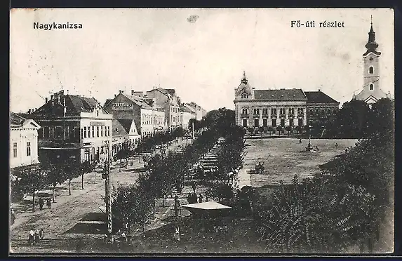 AK Nagykanizsa, Fö-uti reszlet, Strassenansicht mit Kirche