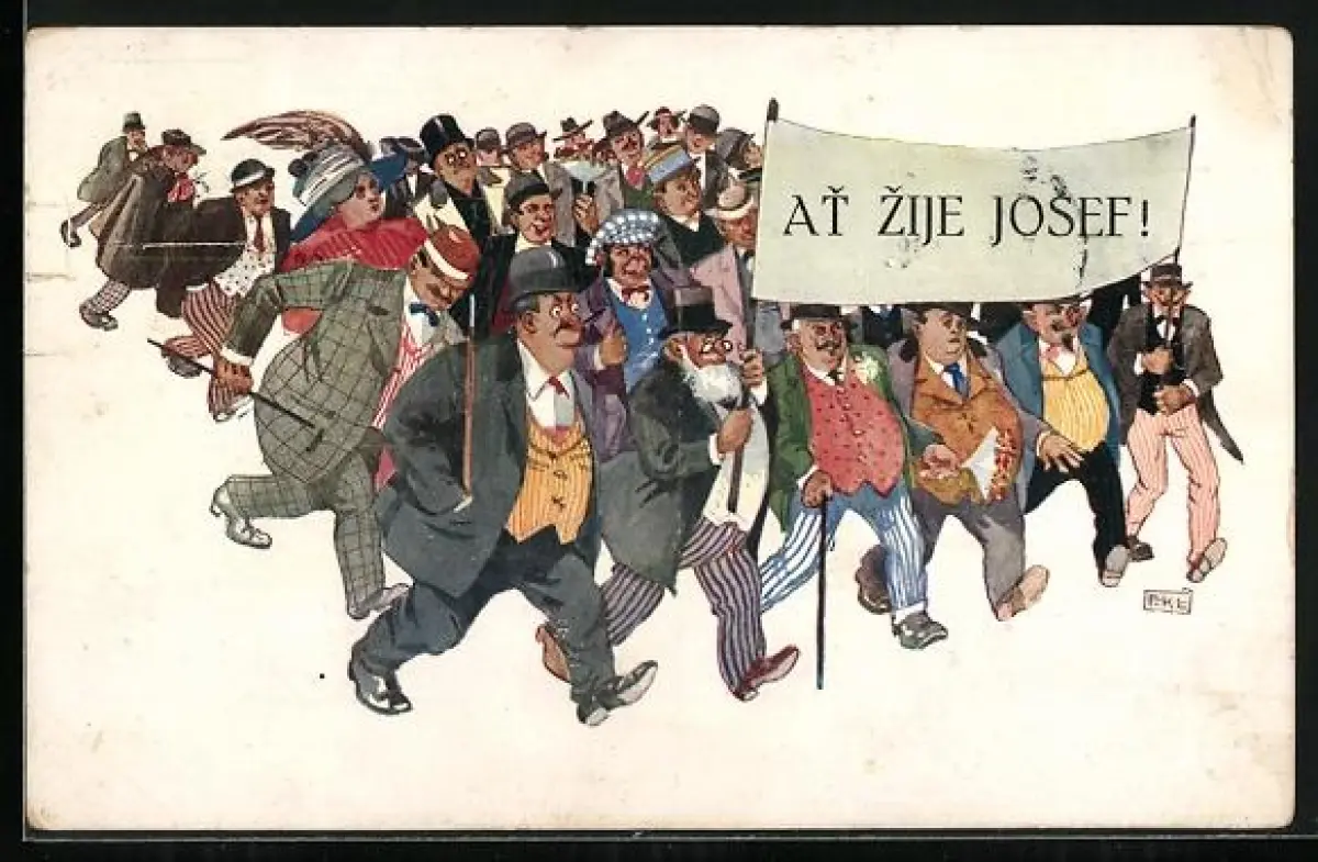 AK Namenstag, Gruppe marschiert mit Schile At Zije Josef