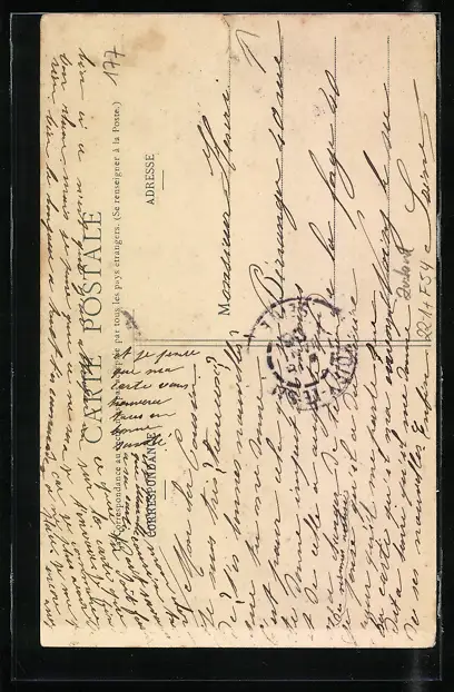 Personenbezogene Daten auf der Rückseite der Karte wurden durch blauen Textmarker unkenntlich gemacht. Die blauen Stellen sind auf die Vorderseite durchgeweicht und wirken sich negativ auf das Postkartenfoto aus