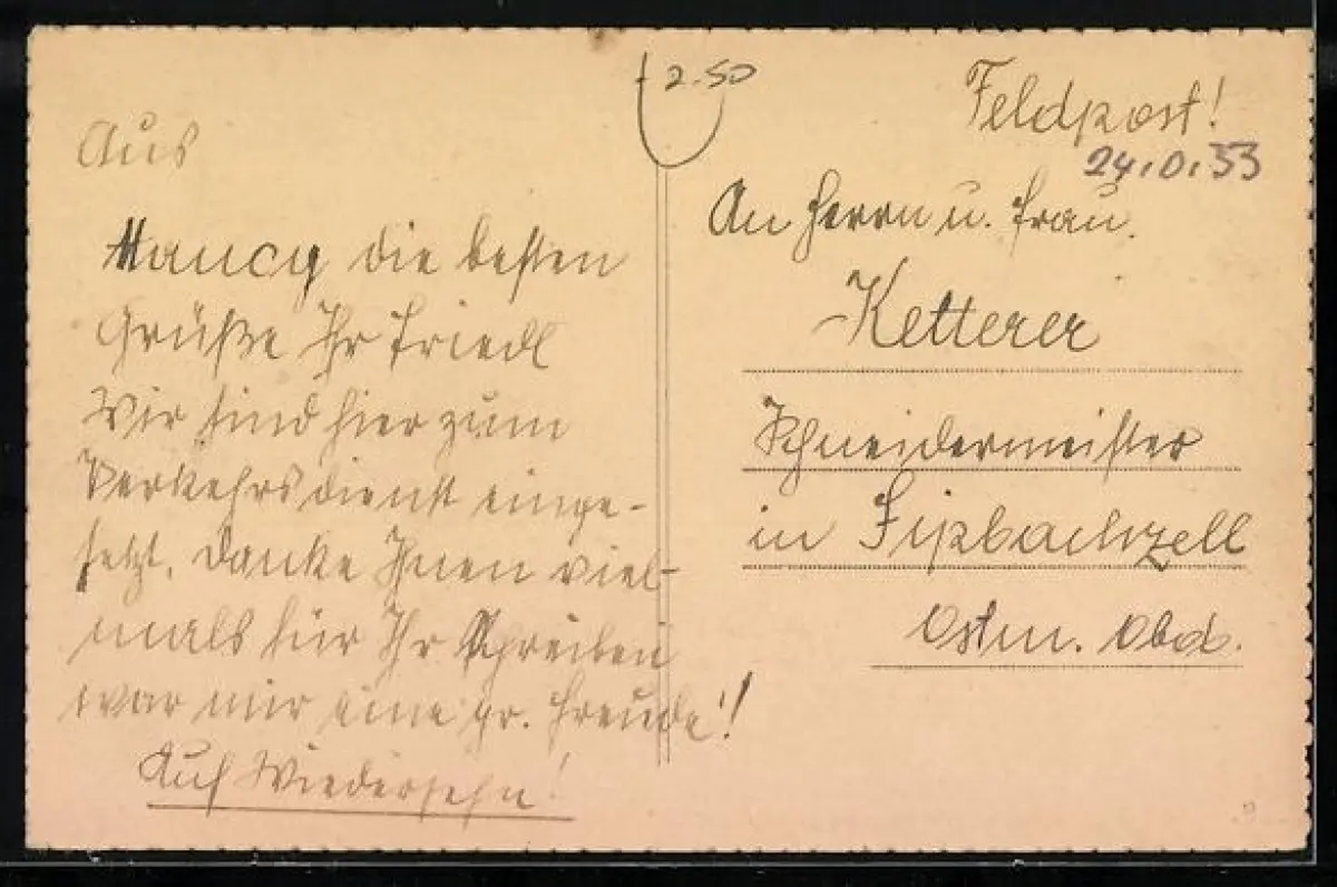 Personenbezogene Daten auf der Rückseite der Karte wurden durch blauen Textmarker unkenntlich gemacht. Die blauen Stellen sind auf die Vorderseite durchgeweicht und wirken sich negativ auf das Postkartenfoto aus