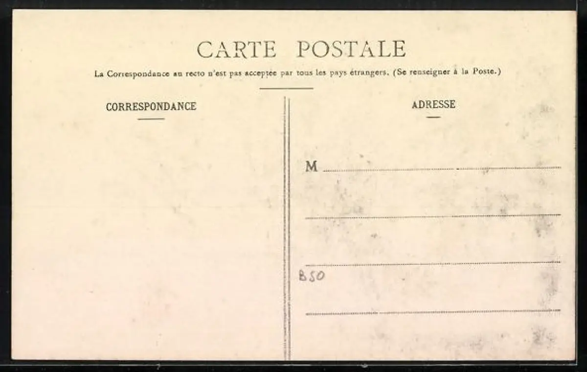 Personenbezogene Daten auf der Rückseite der Karte wurden durch blauen Textmarker unkenntlich gemacht. Die blauen Stellen sind auf die Vorderseite durchgeweicht und wirken sich negativ auf das Postkartenfoto aus