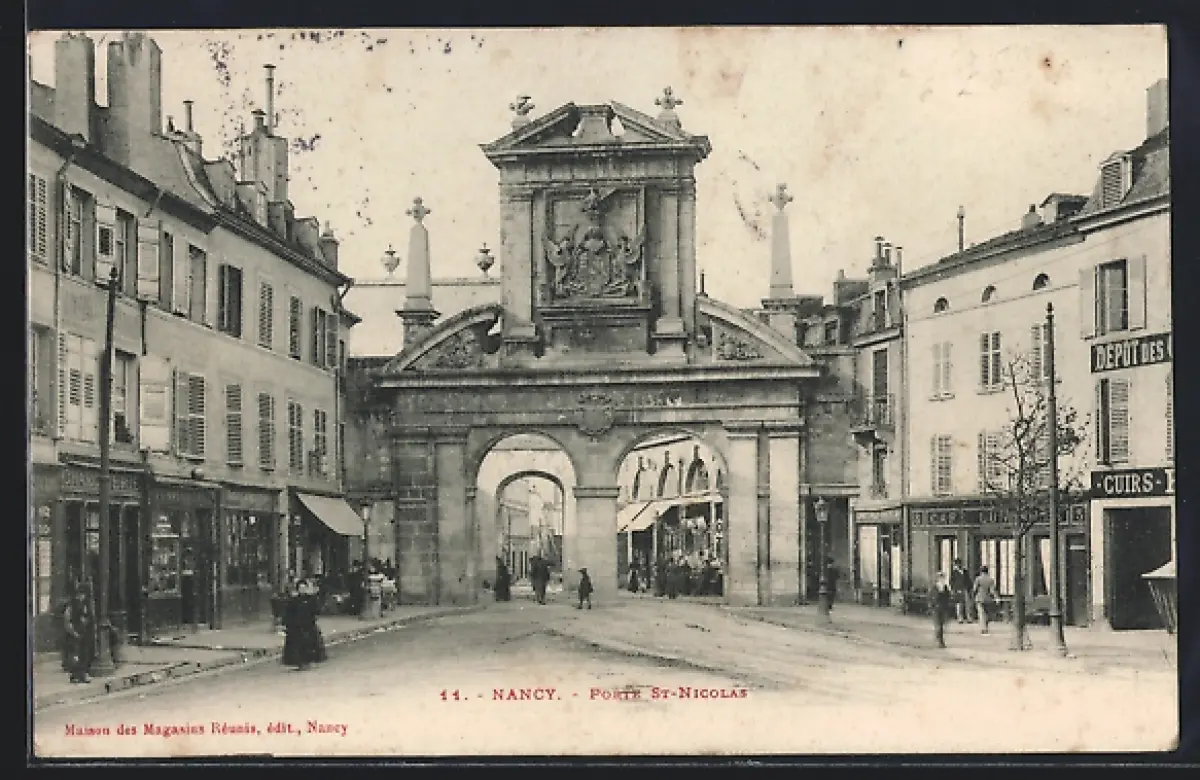 AK Nancy, Porte St-Nicolas avec rue animée et bâtiments environnants