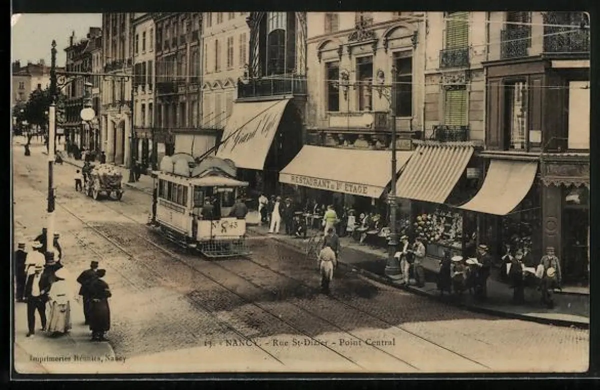 AK Nancy, Rue St-Dizier, Point Central, Restaurant, Strassenbahn