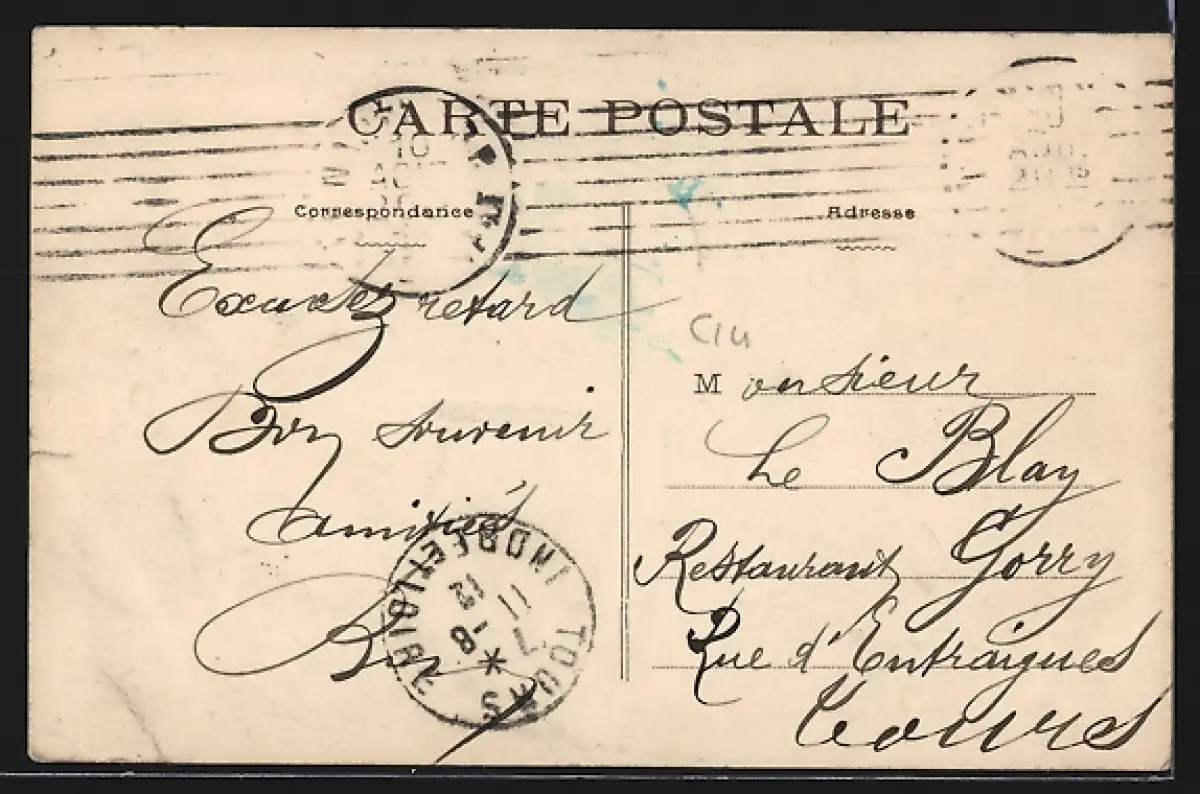 Personenbezogene Daten auf der Rückseite der Karte wurden durch blauen Textmarker unkenntlich gemacht. Die blauen Stellen sind auf die Vorderseite durchgeweicht und wirken sich negativ auf das Postkartenfoto aus