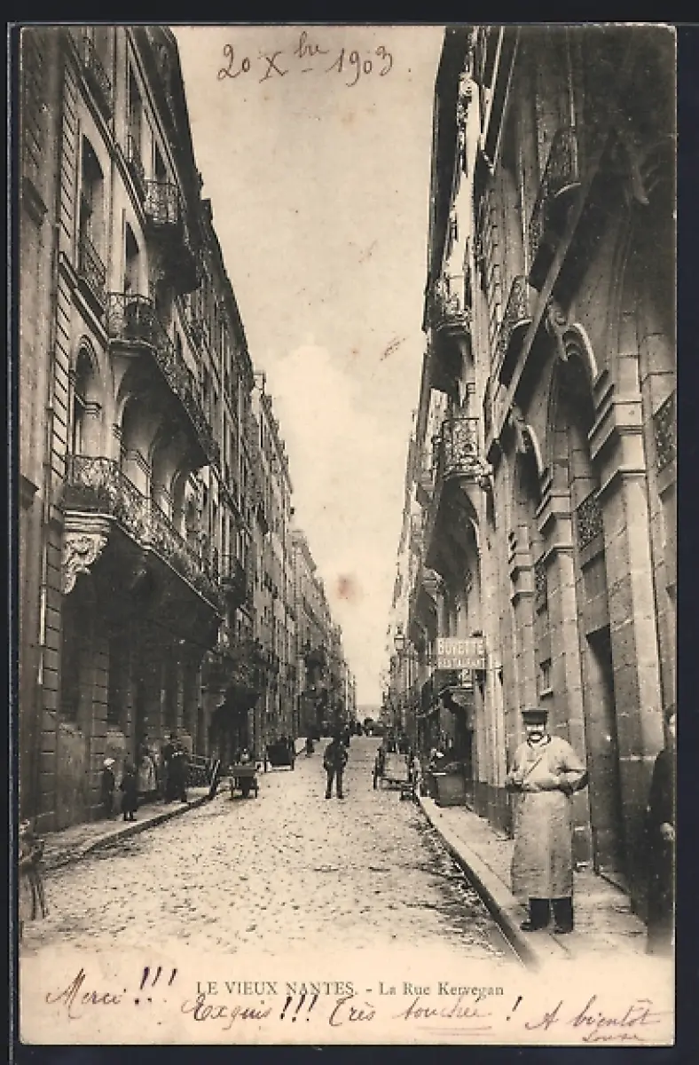 AK Nantes, Le Vieux Nantes, La Rue Kervégan animée avec passants et bâtiments historiques