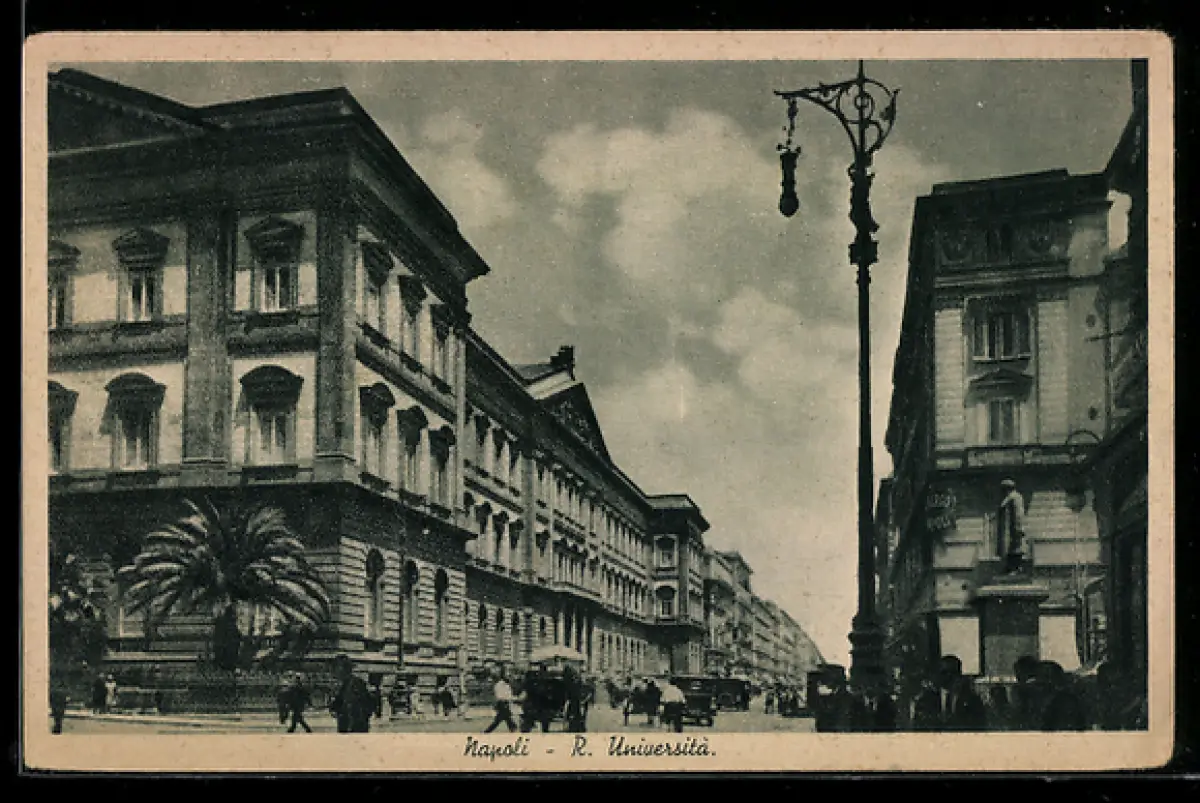 AK Napoli, R. Università, edificio storico e lampione decorativo