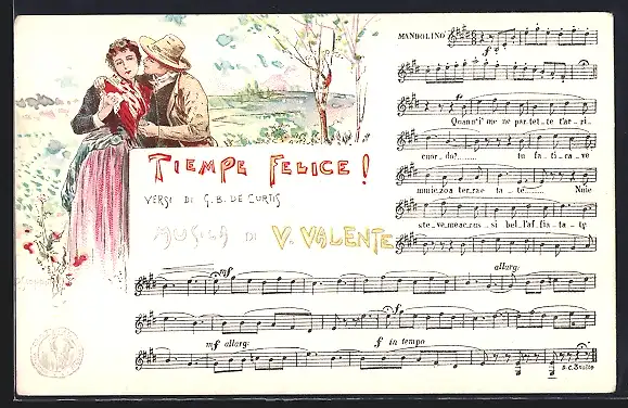 AK Neapel / Napoli, Lied: Tiempe Felice!, Liebespaar in Tracht küsst sich