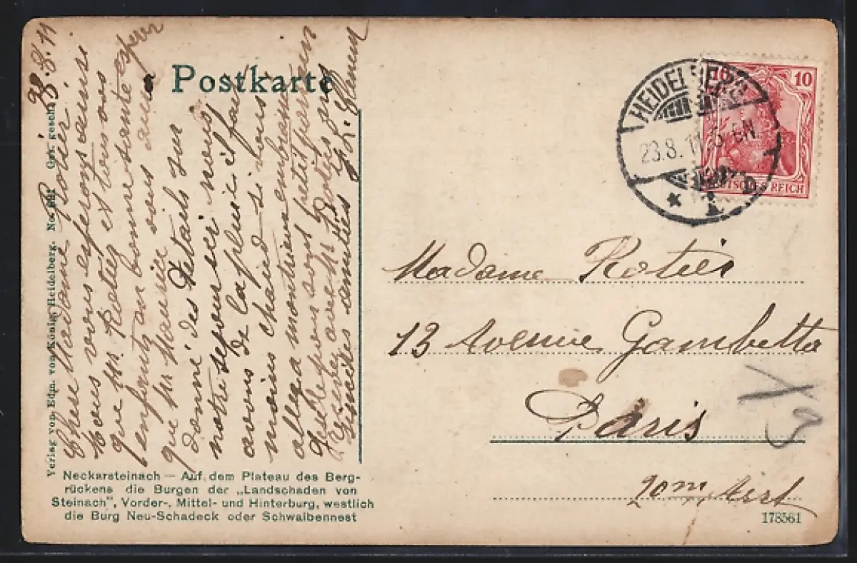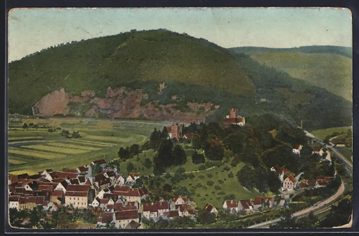 AK Neckarsteinach, Auf dem Plateau des Bergrückens die Burgen der Landschaften von Steinach