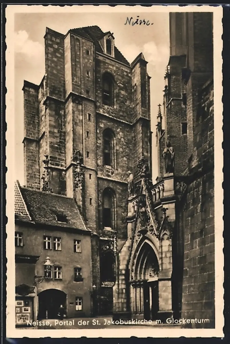 AK Neisse, Portal der St. Jakobuskirche mit Glockenturm