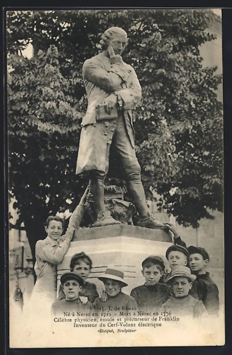 AK Nérac, Statue de J. de Romas, inventeur du cerf-volant électrique, avec enfants posant devant