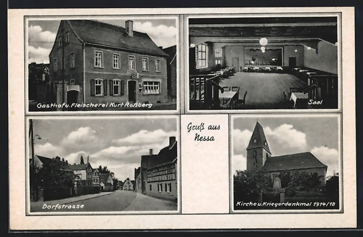 AK Nessa, Gasthof & Fleischerei Kurt Rossberg, Kirche & Kriegerdenkmal 1914 /18, Dorfstrasse