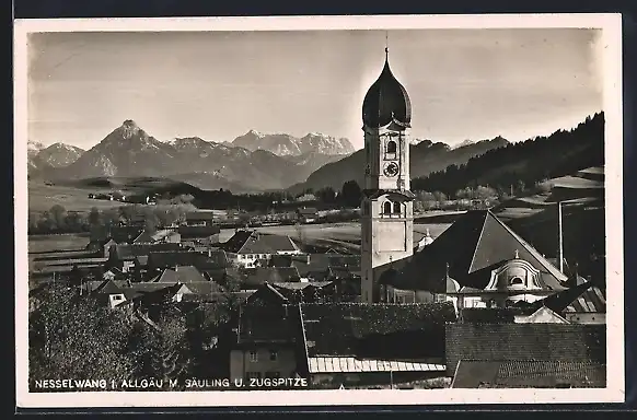 AK Nesselwang, Ortsmitte mit Pfarrkirche, Säuling und Zugspitze