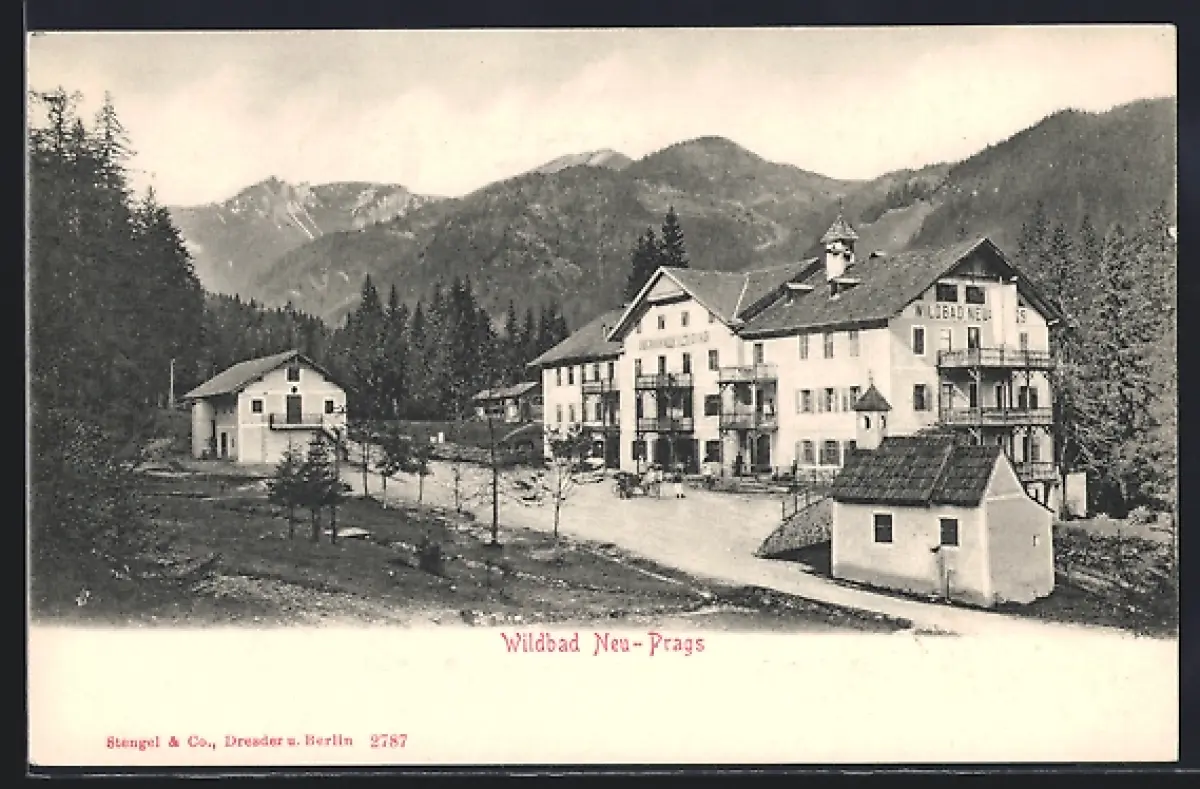AK Neu-Prags, Oberhammers Gasthof mit Bergpanorama