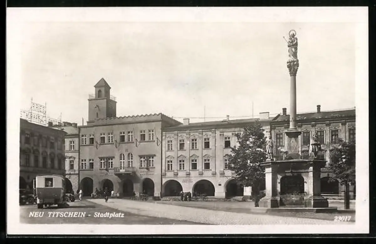 AK Neu Titschein, Stadtplatz mit Denkmal