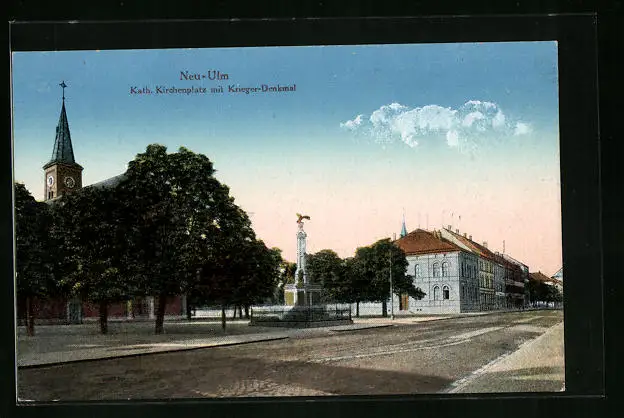 AK Neu-Ulm, Kath. Kirchenplatz mit Krieger-Denkmal