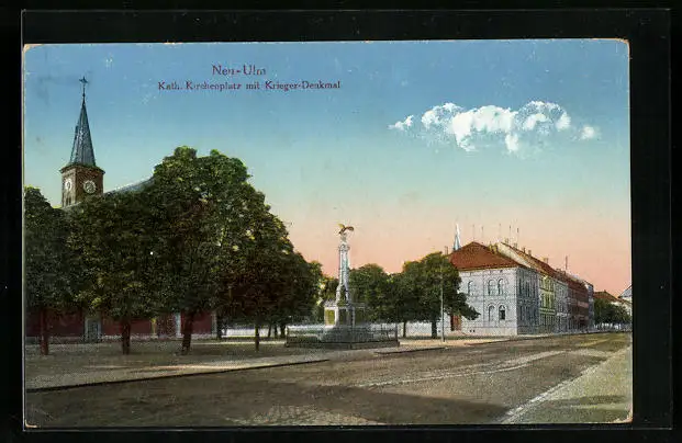 AK Neu-Ulm, Kath. Kirchenplatz mit Krieger-Denkmal