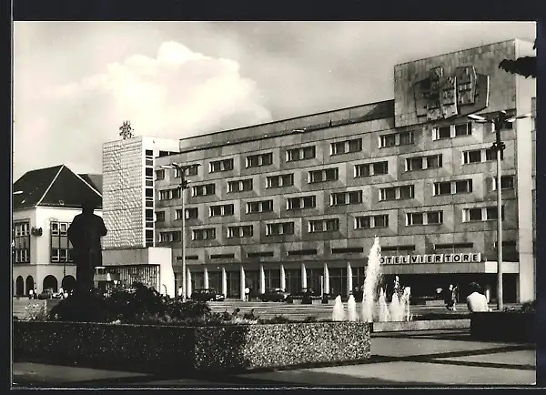 AK Neubrandenburg, Blick auf den Springbrunnen vor dem Hotel Vier Tore