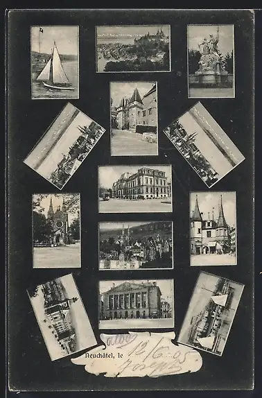 AK Neuchatel, Denkmal, Tor, Kirche, Panorama