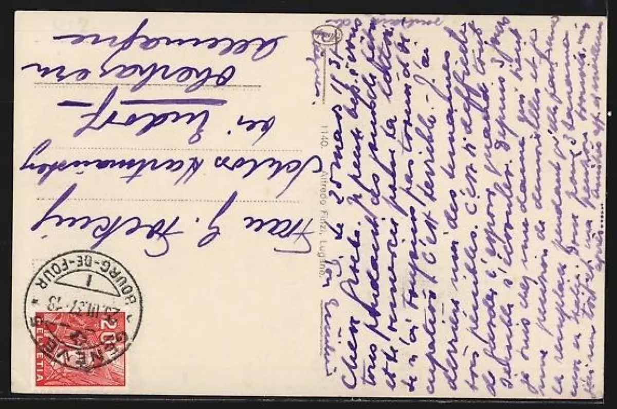 Personenbezogene Daten auf der Rückseite der Karte wurden durch blauen Textmarker unkenntlich gemacht. Die blauen Stellen sind auf die Vorderseite durchgeweicht und wirken sich negativ auf das Postkartenfoto aus