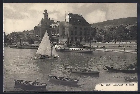 AK Neuchâtel, Le port, Dampfer, Segelboot