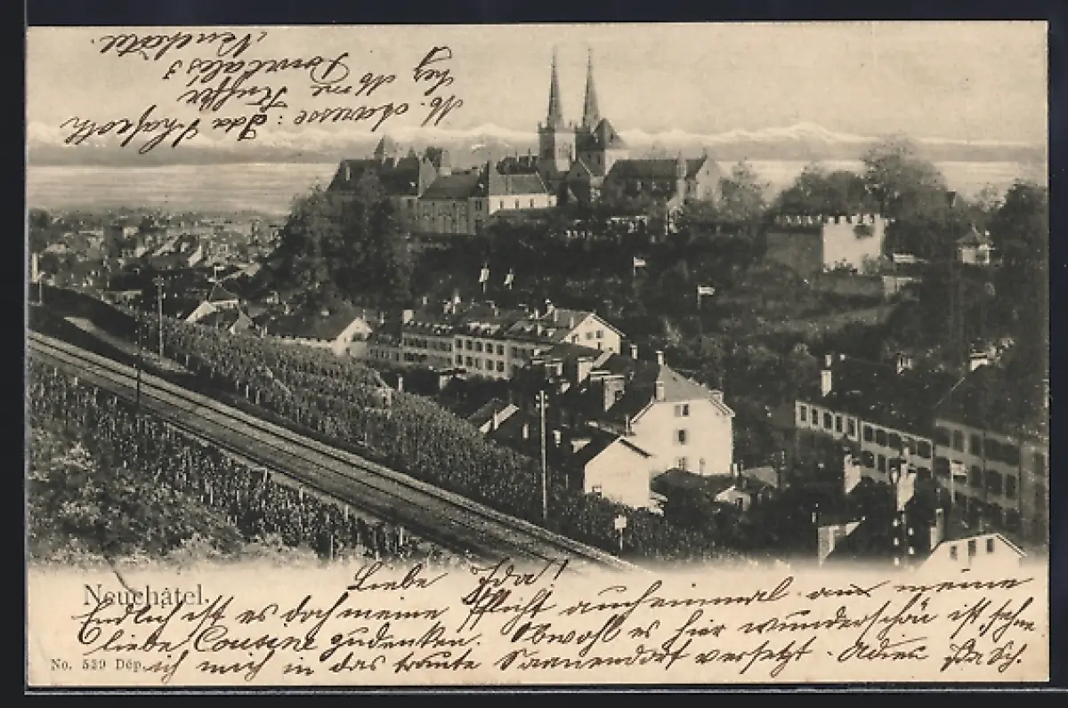 AK Neuchatel, Totalansicht mit Bahnschienen u. Fernblick