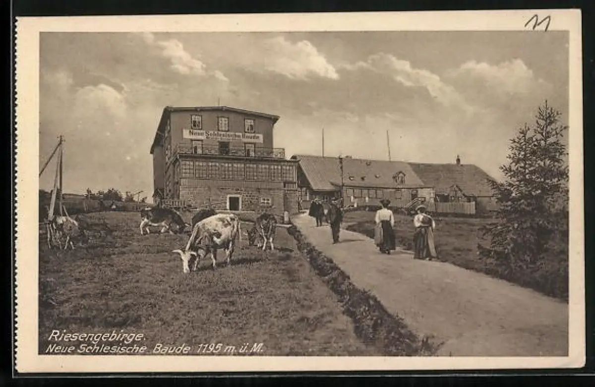AK Neue Schlesische Baude im Riesengebirge mit Kühen