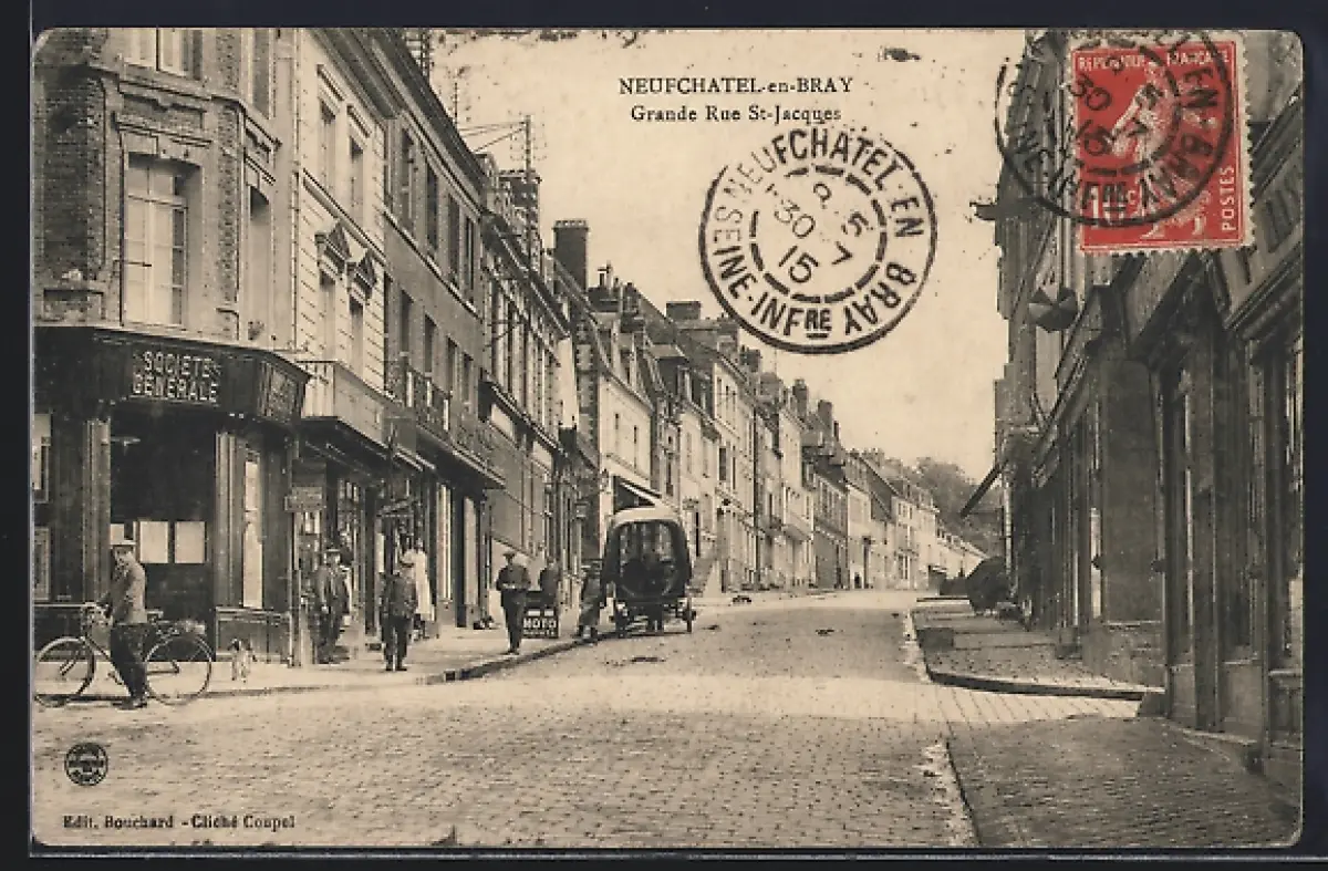 AK Neufchâtel-en-Bray, Grande Rue St-Jacques avec charrette et piétons