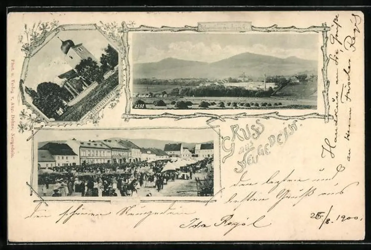 AK Neugedein, Ortsansicht mit Fabrik, Dekanalkirche, Marktplatz mit Ständen