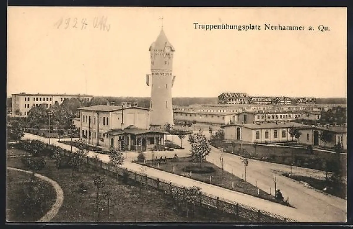 AK Neuhammer a. Qu., Truppenübungsplatz mit Turm und Baracken