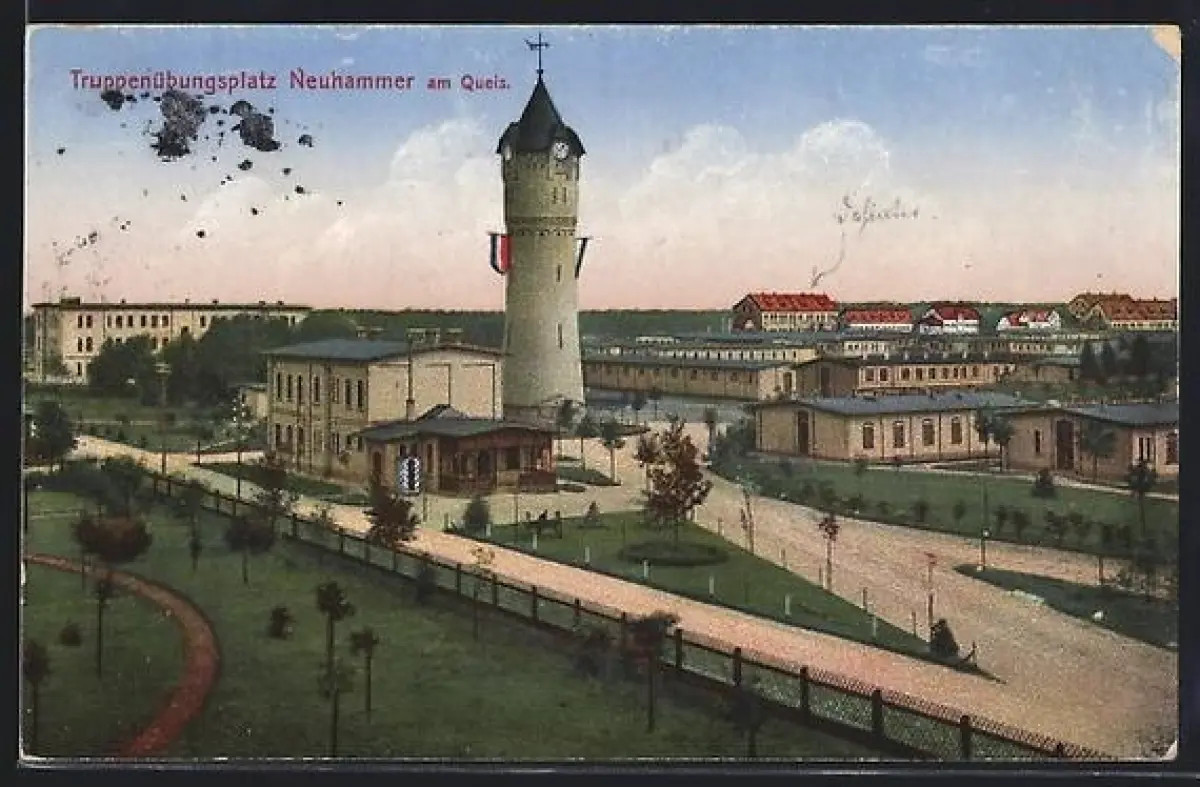AK Neuhammer am Queis, Truppenübungsplatz mit Turm und Baracken