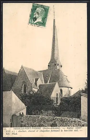 AK Neuille-Pont-Pierre, église, XIIIe-XVIIe s., clocher, chevet et chapelles formant le bas-côté sud