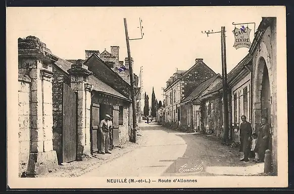 AK Neuillé, Route d`Allonnes avec vue sur le café et passants dans la rue