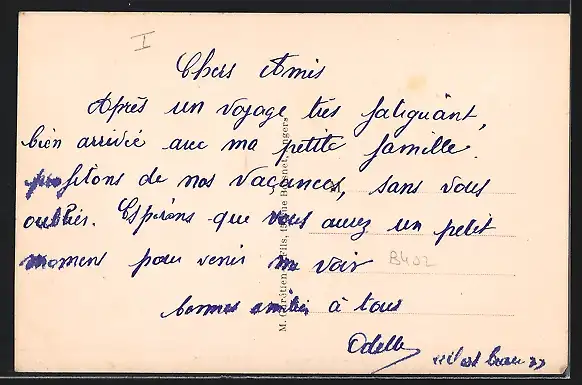 Personenbezogene Daten auf der Rückseite der Karte wurden durch blauen Textmarker unkenntlich gemacht. Die blauen Stellen sind auf die Vorderseite durchgeweicht und wirken sich negativ auf das Postkartenfoto aus