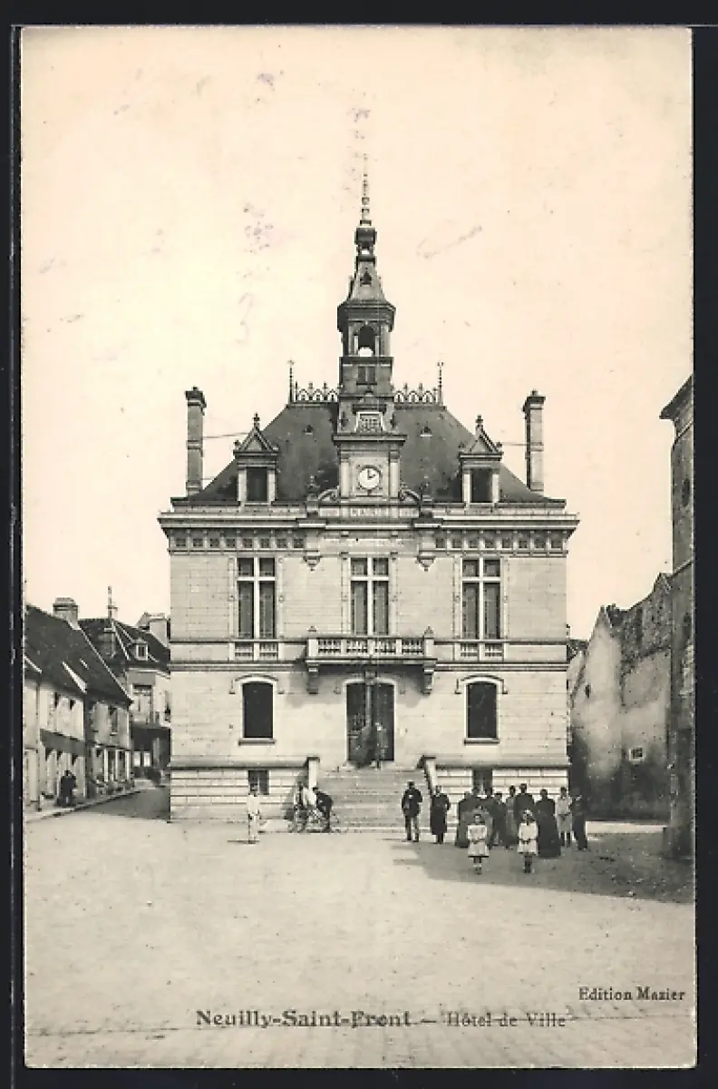 AK Neuilly-Saint-Front, Hôtel de Ville et place animée avec des passants