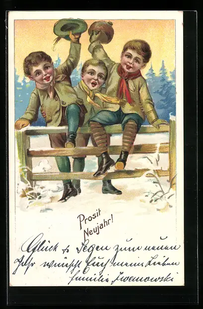 AK Neujahr, Knaben sitzen auf einem Zaun und begrüssen freudig das neue Jahr