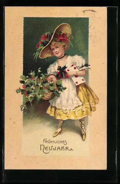 AK Neujahr, Mädchen mit Hut und Kleid und Stechpalmen-Korb