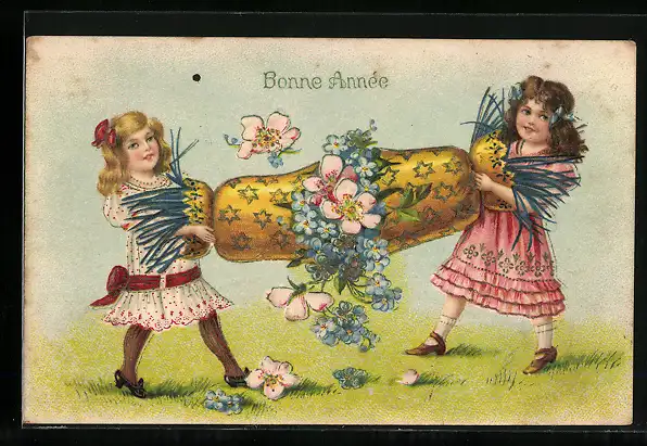 AK Neujahr, Mädchen öffnen ein Bonbon voller Blumen