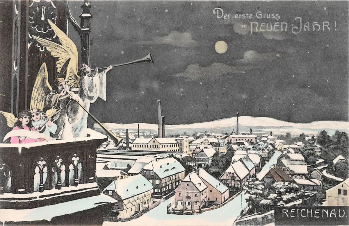 AK Neujahr, Reichenau, Engel auf Kirche, Mondnacht Baden-Württemberg Postkarte