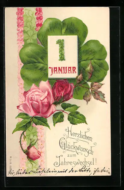 AK Neujahr, Rosen und und aus Blättern geformte 1 auf einem Kleeblatt