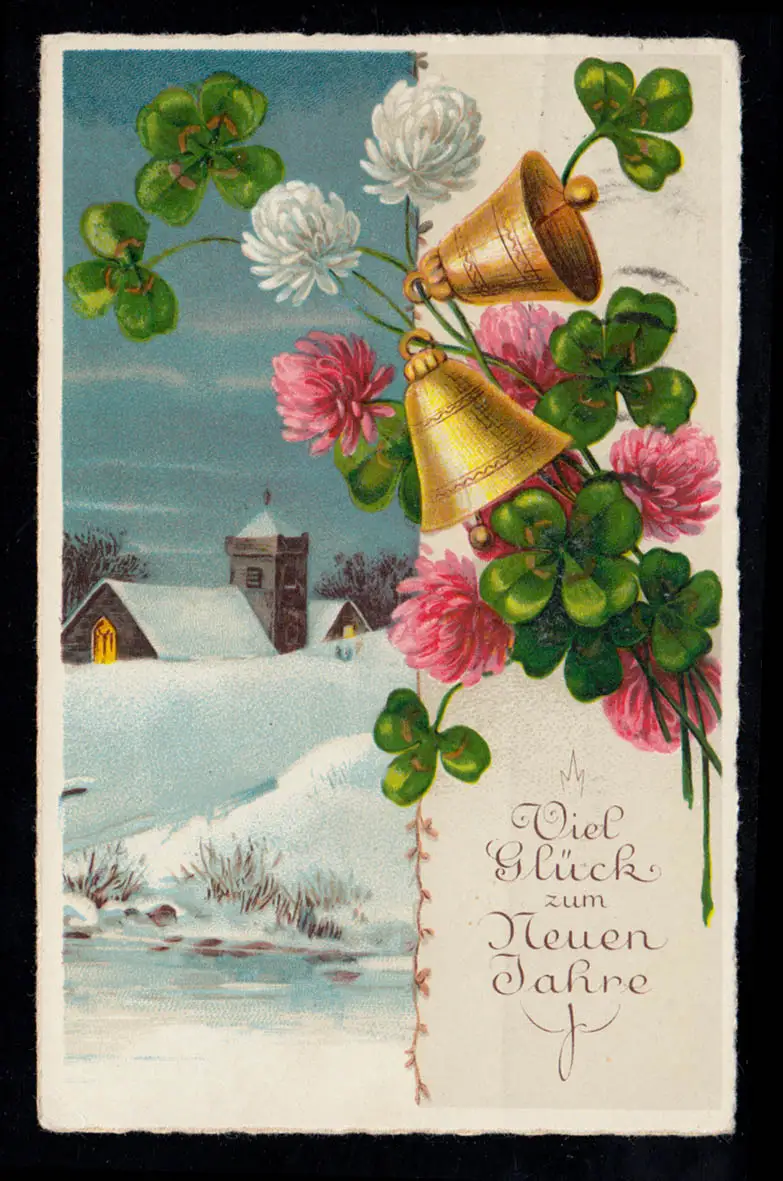 AK Neujahr: Zwei Glocken mit Glücksklee-Verzierung und Kirche, ALTONA (ELBE)