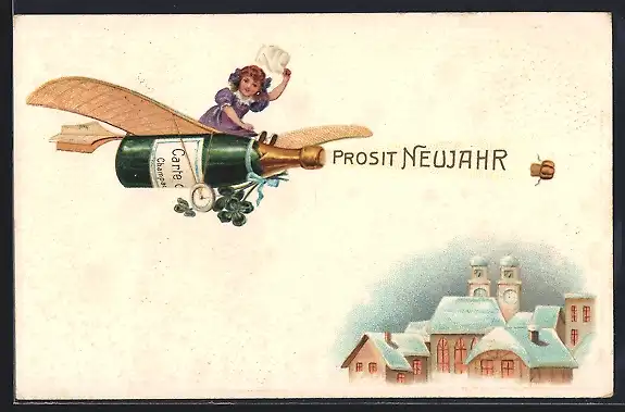 AK Neujahr, junge Dame auf einer Sektflasche als Flugzeug
