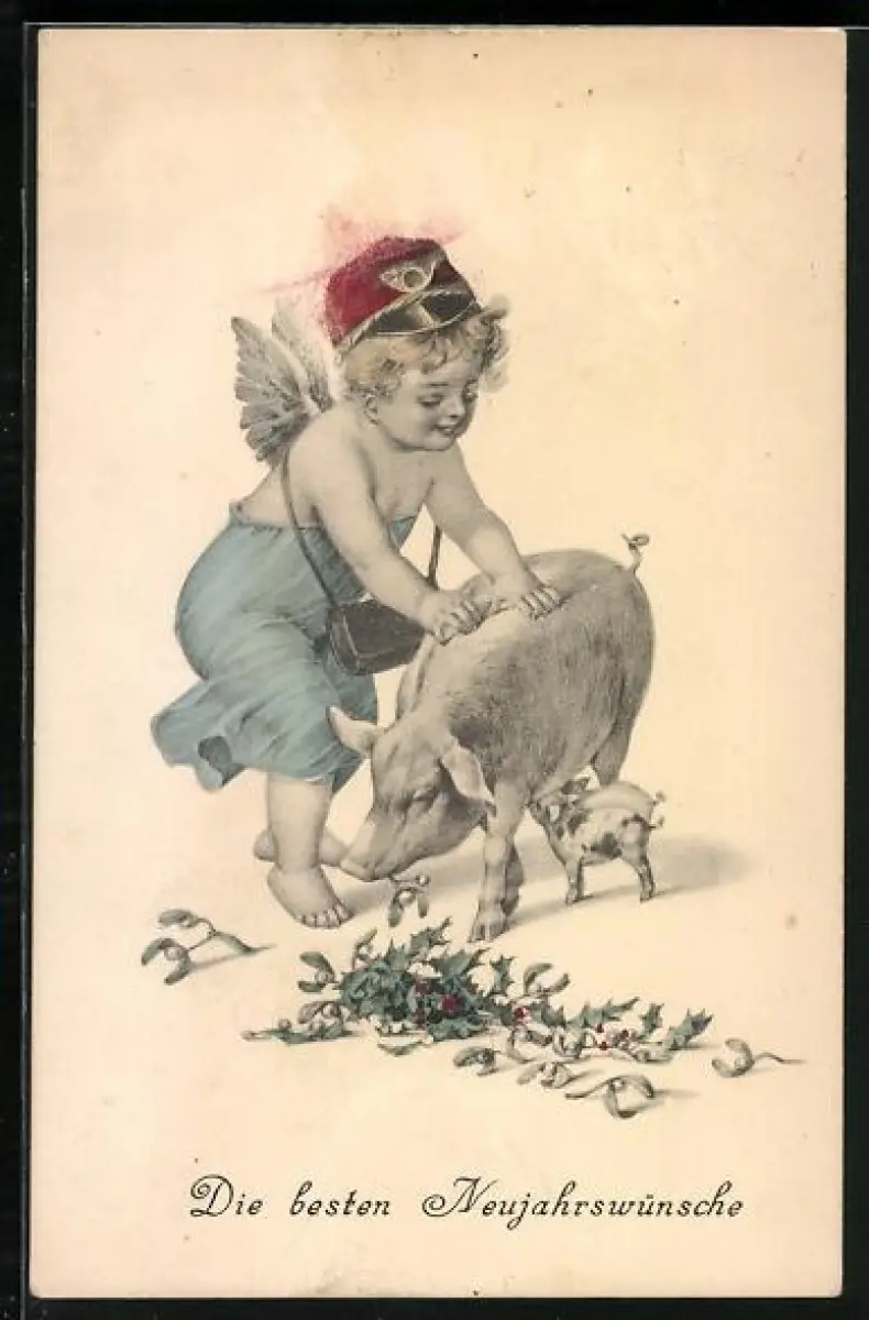 AK Neujahrsengel als Postbote mit Glücksschwein
