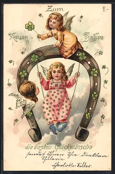 AK Neujahrsengel mit Hufeisen und Kleeblättern