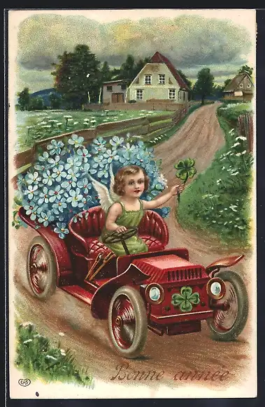 AK Neujahrsengel mit Kleeblatt und Blumen im Auto