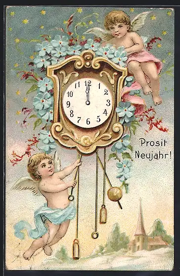 AK Neujahrsengel mit Wanduhr um Mitternacht, Vergissmeinnicht und Winterlandschaft