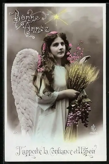 AK Neujahrsengel mit Weizen und Trauben, Bonne Année
