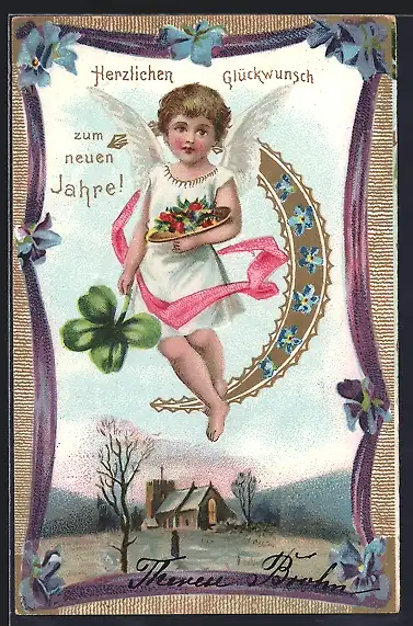 AK Neujahrsengel schwebt mit einem Kleeblatt über der Kirche