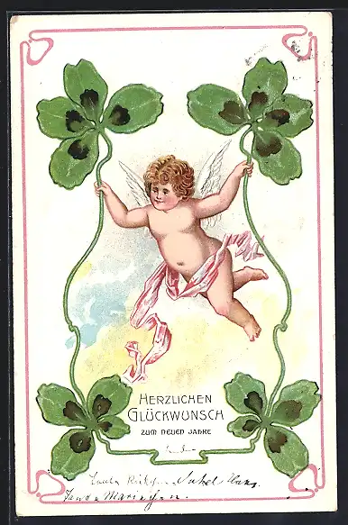 AK Neujahrsengel schwebt zwischen Kleeblättern