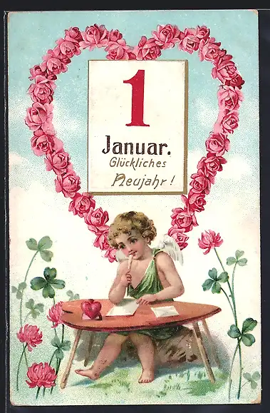AK Neujahrsengel sitzt an einem Tisch, Kalenderblatt 1. Januar