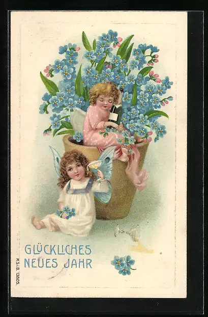 AK Neujahrsengel und Fee trinken Sekt an einem Topf Vergissmeinnicht